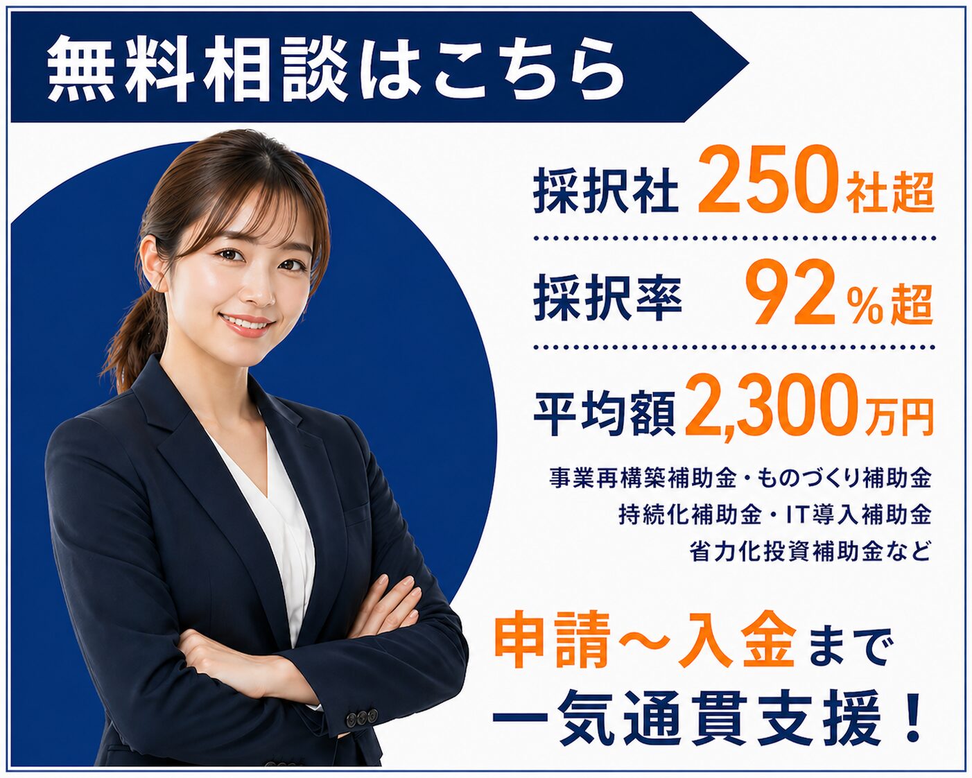 - これまでに100社以上の資金調達を支援し、採択率80%超の実績。戦略コンサルティングファームでの経験を活かし、現在は事業再構築補助金・ものづくり補助金を中心とした資金調達支援を行っています。単なる申請代行にとどまらず、事業計画の整理から採択後の実行フェーズまでを見据えた伴走支援を重視。初めて補助金申請を行う企業様にも安心してご相談いただけるよう、わかりやすく丁寧なサポートを心がけています。これまでの支援実績をもとに、各企業様の状況に応じた最適な申請戦略をご提案いたします。