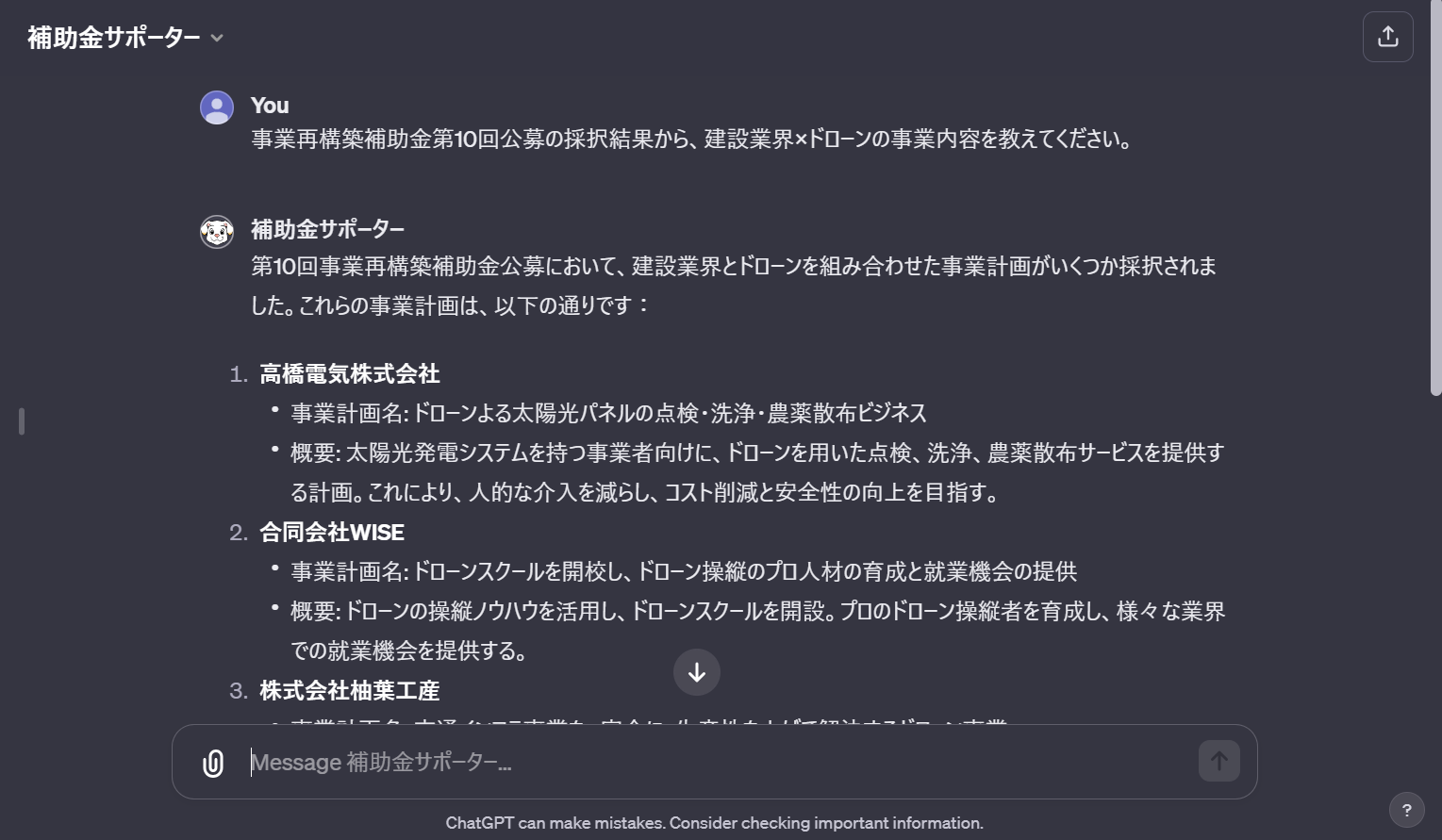 補助金にはそれぞれ申請要件や対象経費、補助上限、補助率など、類型ごとに満たすべき要件が設けられています。本GPTでは、使いたい対象経費や事業概要、業種・業態を入力すると、過去の採択事例を遡って、補助金ごとの具体的な活用事例を提案してくれるサービスです。初めての補助金申請で何から確認すべきか分からない経営者に対して、安心して補助金申請を進めることができます。