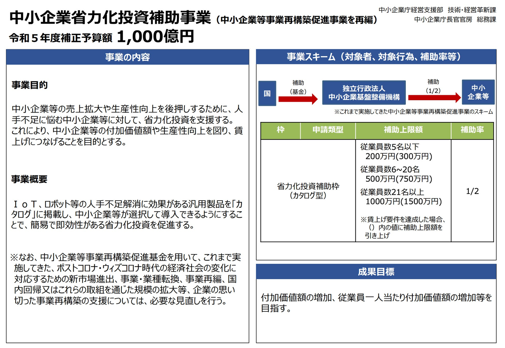 中小企業のDX・IoT・AI導入などの費用を最大1,500万円、補助率1/2の条件で補助します。