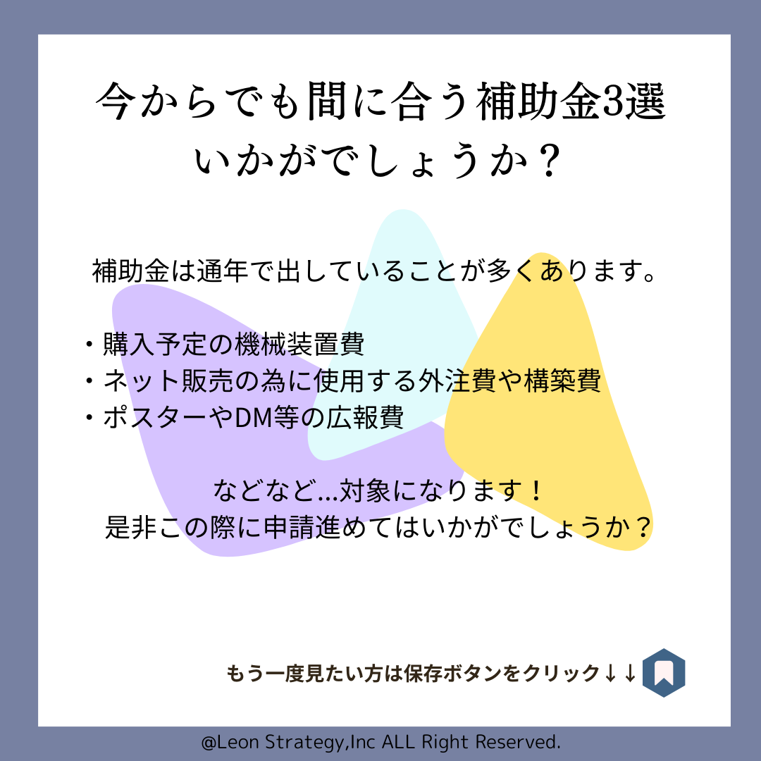 コンテンツ詳細 おすすめ補助金3選 簡単解説 以下のコンテンツは無料でDLいただけます。 補助金3選_v1補助金3選_v1 (8)補助金3選_v1 (7)補助金3選_v1 (6)補助金3選_v1 (5)補助金3選_v1 (4)補助金3選_v1 (3)補助金3選_v1 (2) DLリンク:おすすめ補助金3選.pdf 補助金の相談窓口 本資料に関して、また補助金の申請に関してご不明点などありましたら下記までお問合せください。 【2025年版】補助金ガイドブックプレゼント中! 補助金ガイドブックを配布中です。要件や事例、採択のコツをまとめた内容です。 今すぐ無料で受け取る \ 3分で完了!LINEで気軽に質問できます / 満員御礼 2023.11 経営者交流会 2024年 省エネ設備導入に使える補助金